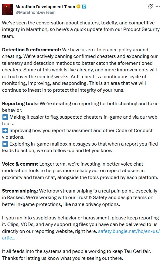 X’teki resmi Marathon geliştirici hesabı, oyundaki hileciler, toksisite ve rekabetçi bütünlük hakkında bir güncelleme paylaştı. Bungie, hilecileri aktif olarak banladığını ve oyunu kötüye kullananlara karşı sıfır tolerans politikasını sürdürdüğünü açıkladı. Bununla birlikte Bungie, hile ve toksik davranışları bildirme araçlarını da geliştiriyor.