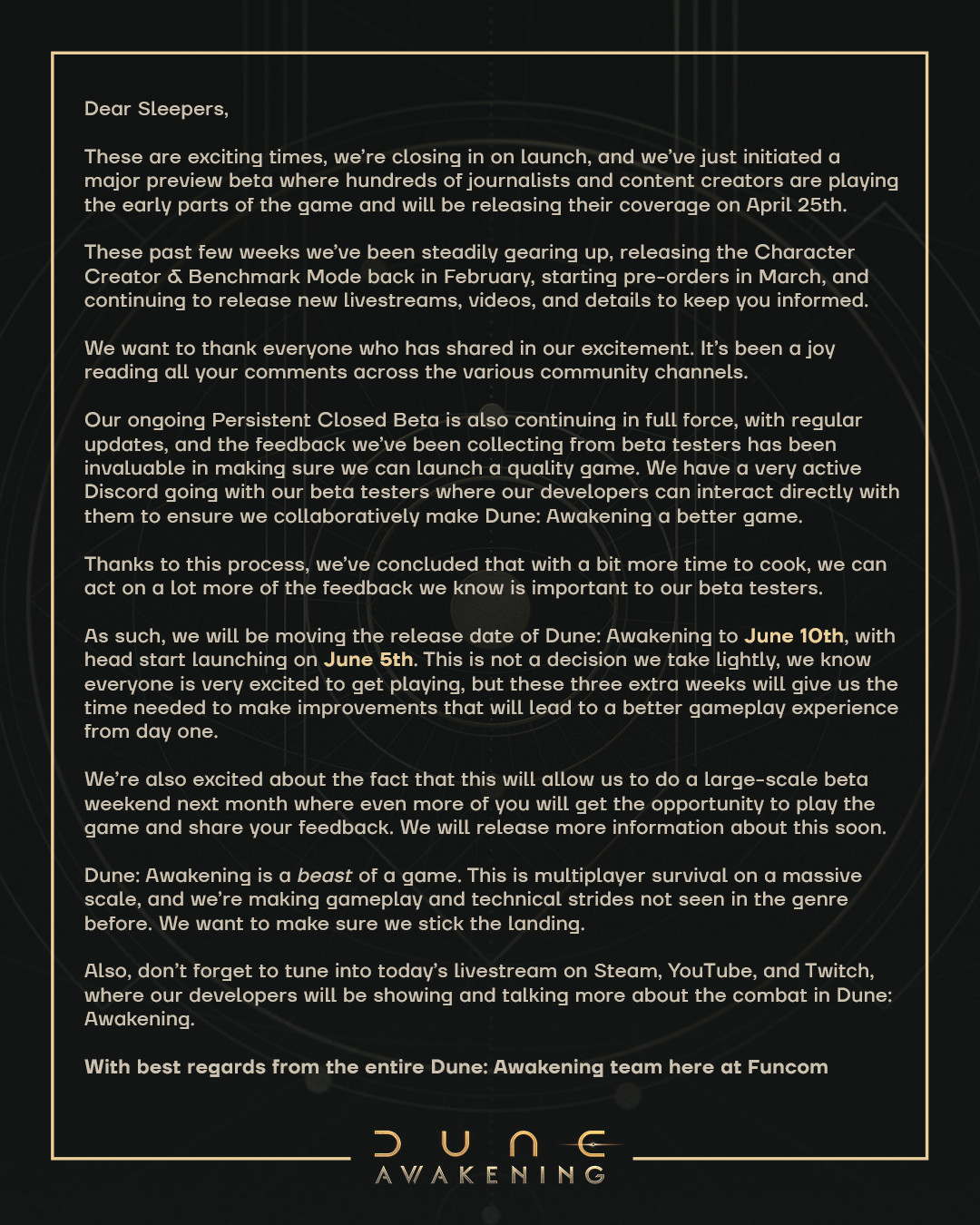 Erteleme kararının kapalı beta sürecinde alındığı belirtilirken açıklamanın devamında, “Beta tester’larımızla doğrudan iletişim kurduğumuz aktif bir Discord topluluğumuz var. Geliştiricilerimiz bu sayede oyuncularla birebir etkileşime girerek Dune: Awakening’i daha iyi bir hale getirebiliyor. Bu süreç sayesinde, biraz daha zaman tanındığında oyuncularımızın önem verdiği pek çok geri bildirimi uygulamaya koyabileceğimizi gördük.” denildi.