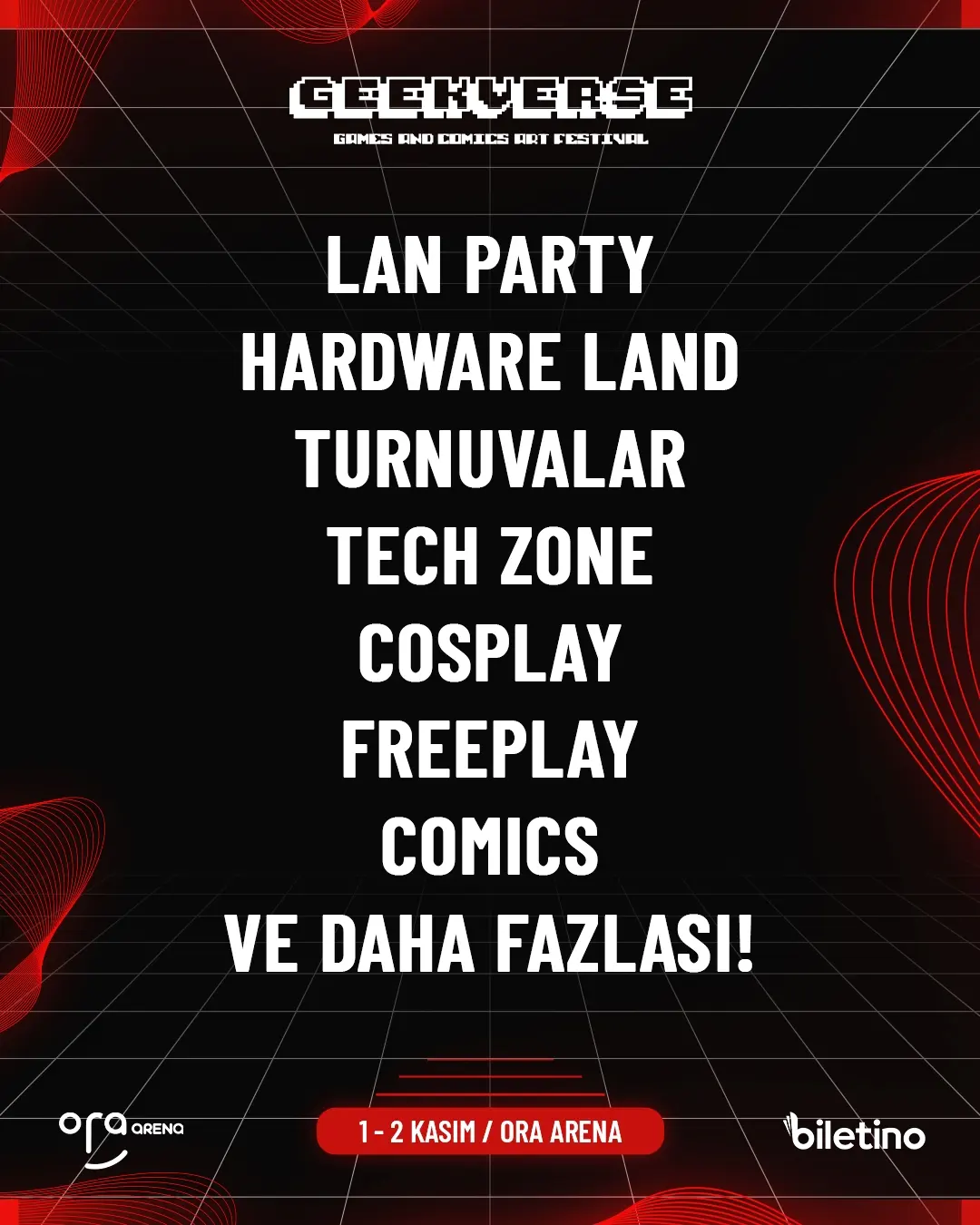 GeekVerse İstanbul 2025’te; League Of Legends, PUBG Mobile, Valorant ve CS 2 gibi oyunların bol ödüllü Espor turnuvaları, yeni ürünlerin sergileneceği Tech Zone stantları, bu yıla özel Halloween konseptli cosplay yarışması, TCG Cards ve Çizgi Roman alanları ziyaretçileri bekliyor olacak.