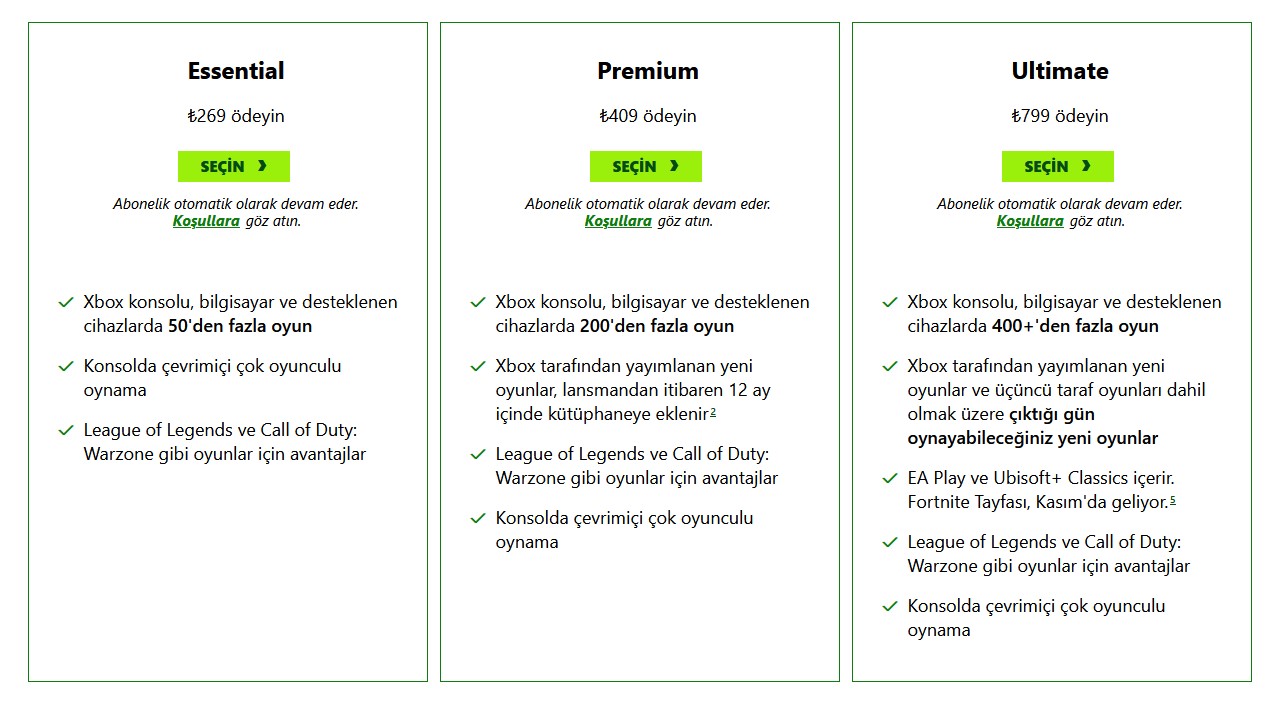 400’den fazla oyunun dahil olduğu Xbox Game Pass Ultimate paketi aylık 19.99 dolardan 29.99 dolara çıktı. 50’den fazla oyunu kapsayan Xbox Game Pass Essential paketi aylık 9,99 dolar ve 200’den fazla oyunu içeren Xbox Game Pass Premium paketi aylık 14.99 dolar olarak kaldı.
